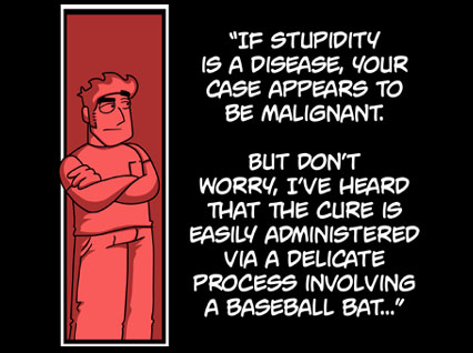 1de52a1bf72e Published 2009/09/05 at 426 × 318 in 1de52a1bf72e ← Previous Next → http://www.ctrlaltdel-online.com/ “If stupidity is a disease, your case appears to be malignant. But don’t worry, I’ve heard that the cure is easily administered via a delicate process involving a baseball bat…”
